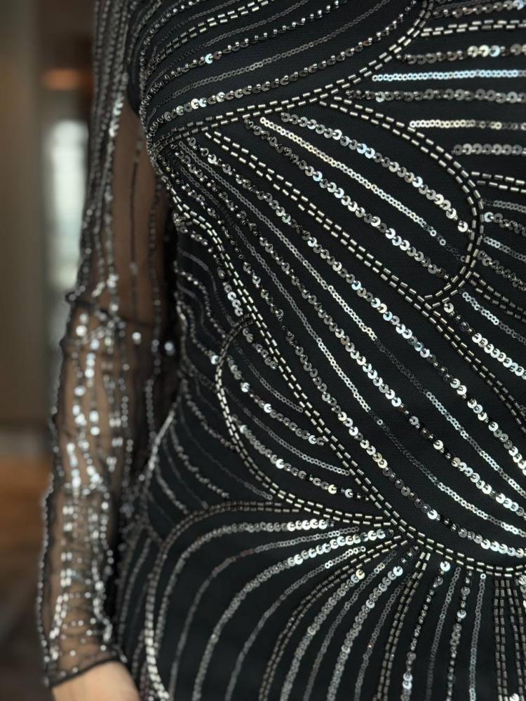 - فستان سهرة لامع تصميم أنيق بلمعة ناعمة يعكس الإضاءة ويضفي بريقًا ملفتًا